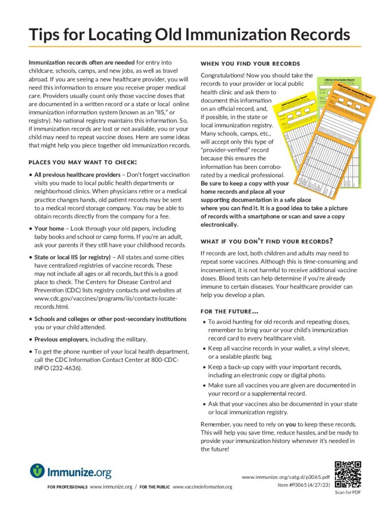Also see Tips for Finding Vaccine Records, which includes printable vaccine records for adults and children.